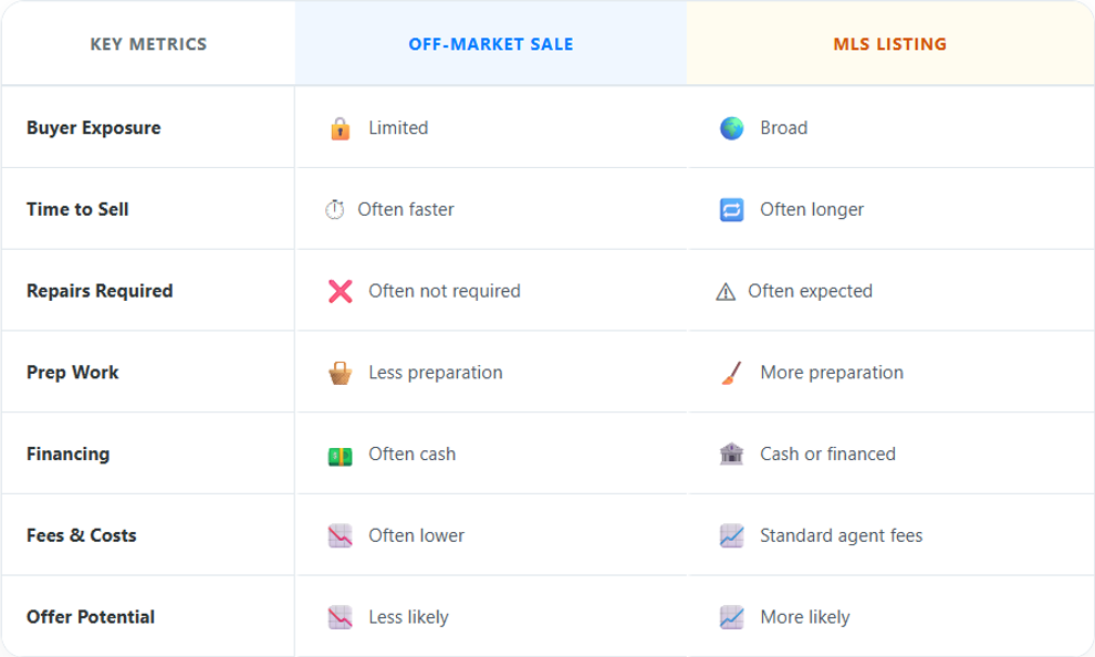 Off-market sales often appeal to homeowners who value clarity, fewer moving parts, and a more direct timeline, even if the process involves fewer competing buyers.